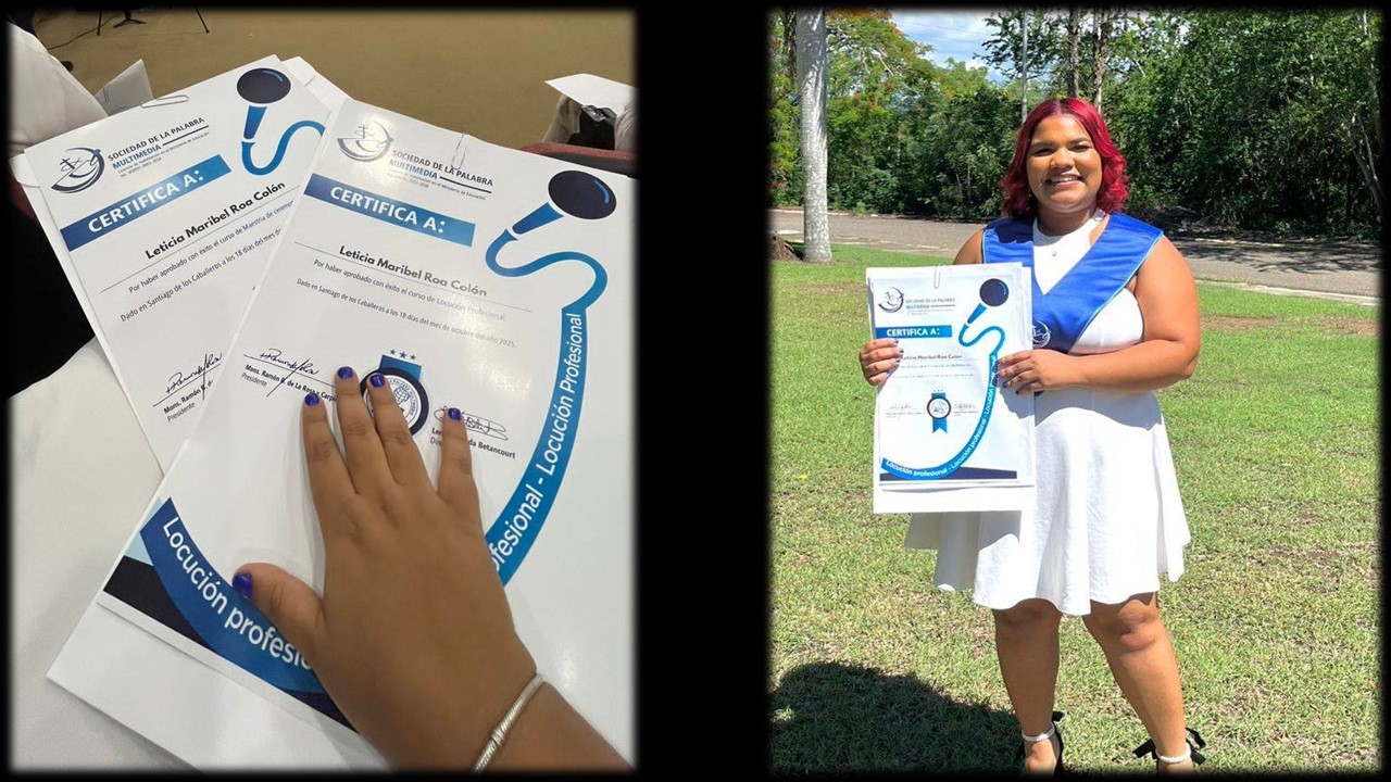 Roa Colón recibió las titulaciones de Locución Profesional y Maestría de Ceremonias, logros que demuestran su firme compromiso con la excelencia y su visión de convertirse en una profesional integral, capaz de aplicar la comunicación efectiva y responsable tanto en los medios como en la gestión institucional.